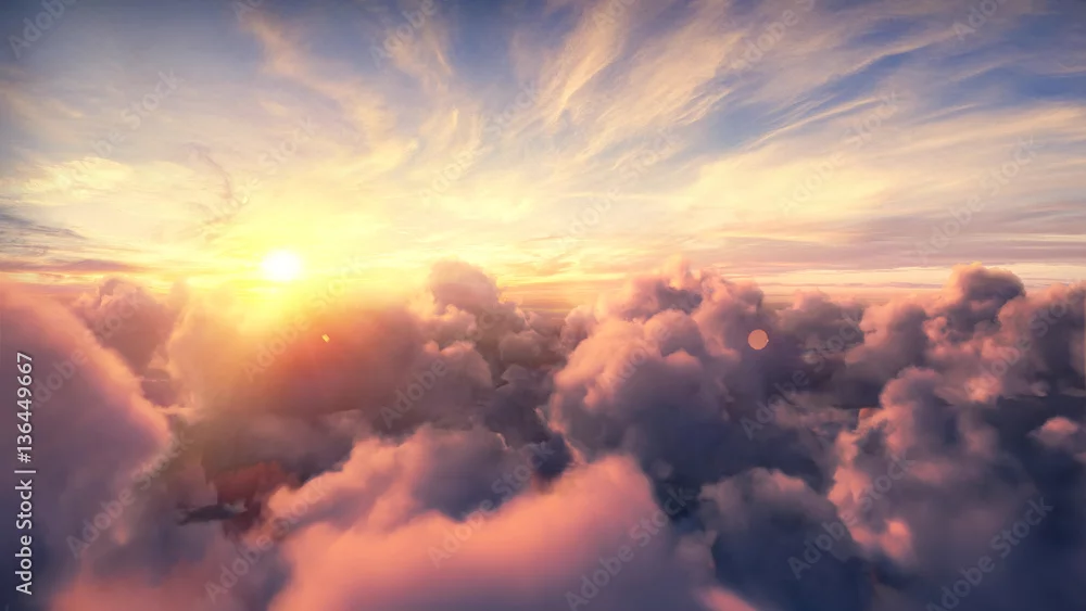 Obraz Latające nad wieczorem timelapse chmury z późnym słońcem. Lot przez poruszający się krajobraz z pięknymi promieniami słońca. Podróż samolotem. Idealny do kina, tła