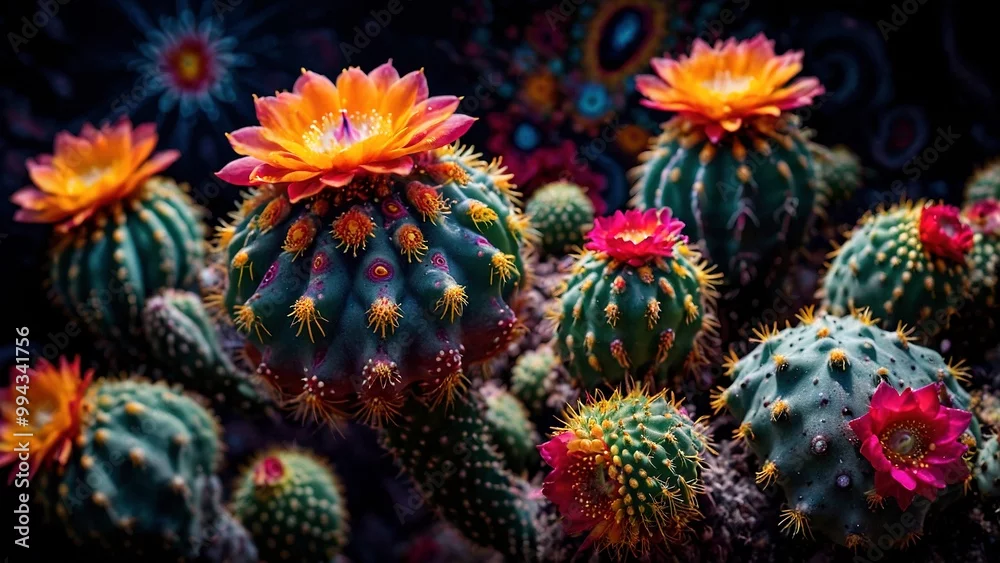 Obraz Beautiful psychedelic art illustration of entheogenic flowering Peyote cactuses against the dark background. Vibrant Lophophora williamsii trippy psychoactive psy trance illustration artwork.