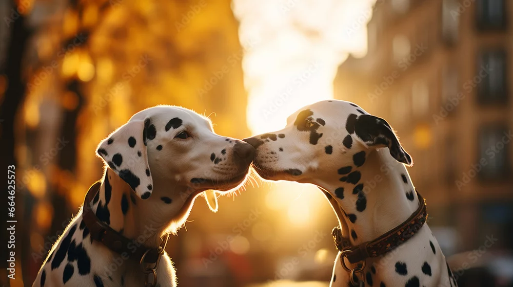 Obraz Dwa psy dalmatyńczyki całują się podczas zachodu słońca - psy - Picturewall.pl
