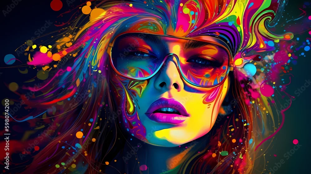 Obraz Kaleidoscope Vision: A Generative AI Creation of a Psychedelic Trance-Inspired Woman, Colors Bursting and Surrounding Her