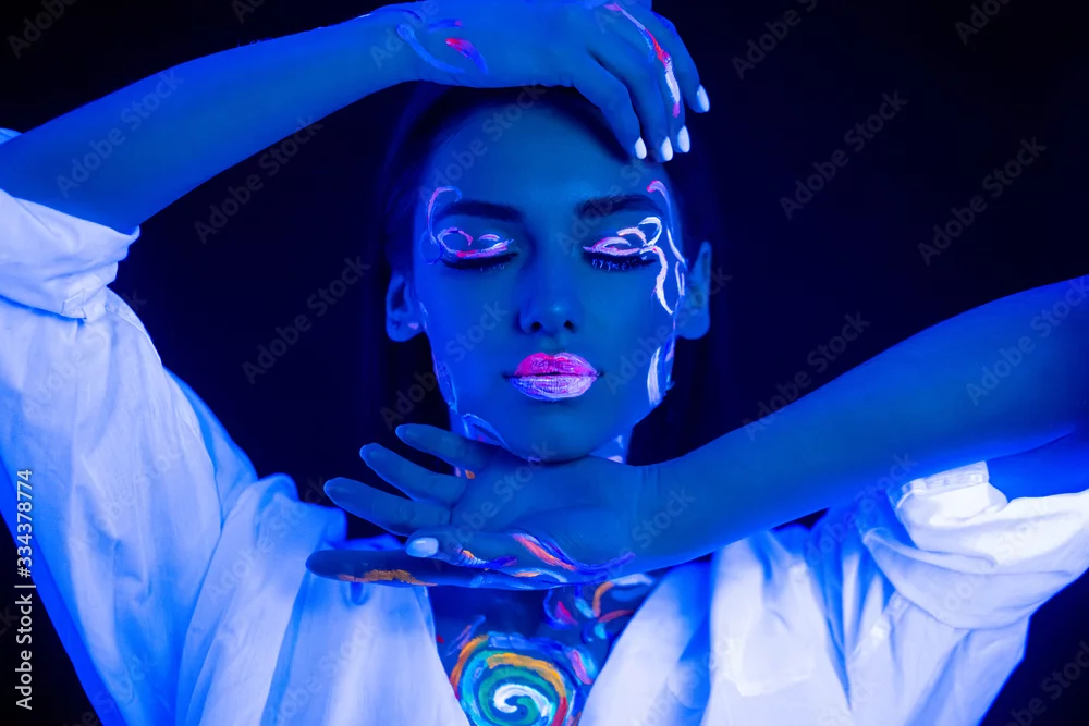 portrait of beautiful caucasian fashion model with fluorescent make-up, unusual colorful prints glows in UV lights. decoration, design, body art, luminescence concept