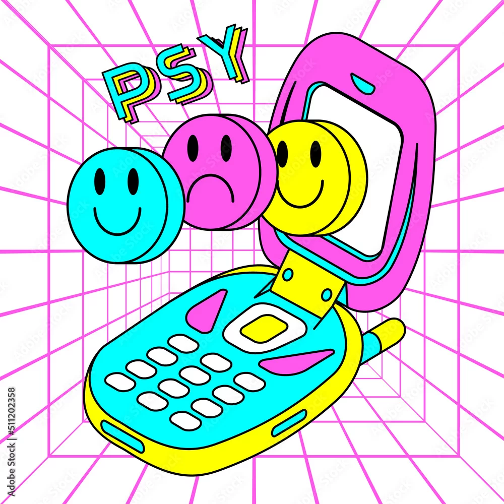 Weird sticker in acid trippy style. Old electronic device with abstract psychedelic elements. Pop 90s style. Editable fluorescent y2k print for tee, streetwear.
