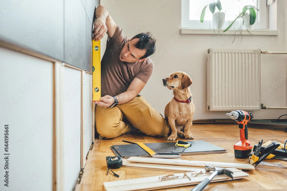 Obraz Mężczyzna i jego pies robi remontowej pracy w domu