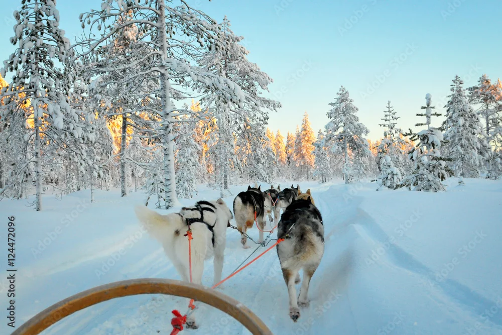Obraz Psy zaprzęgowe biegają w lesie Laponii