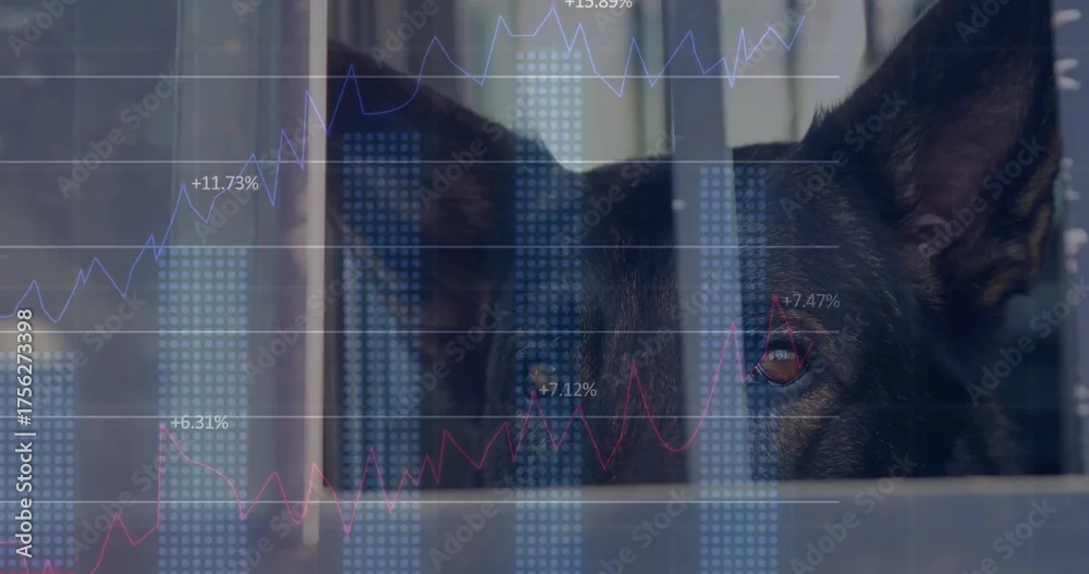 Obraz Staring dark-coated dog peering through metal bars inside kennel, with financial overlay graphics