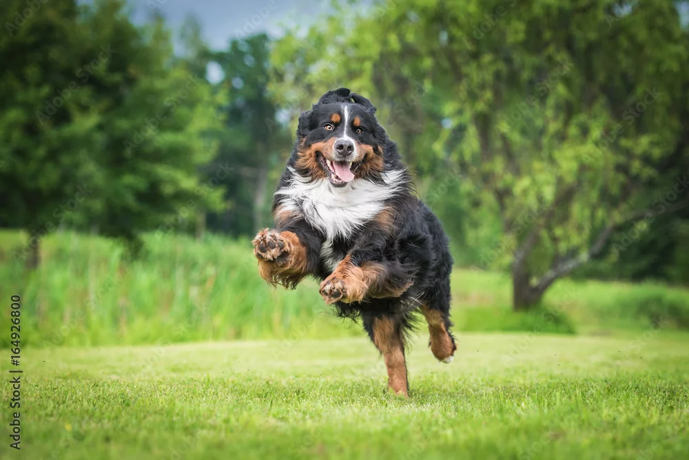 Obraz Szczęśliwy berneński góra pies bawić się w jardzie