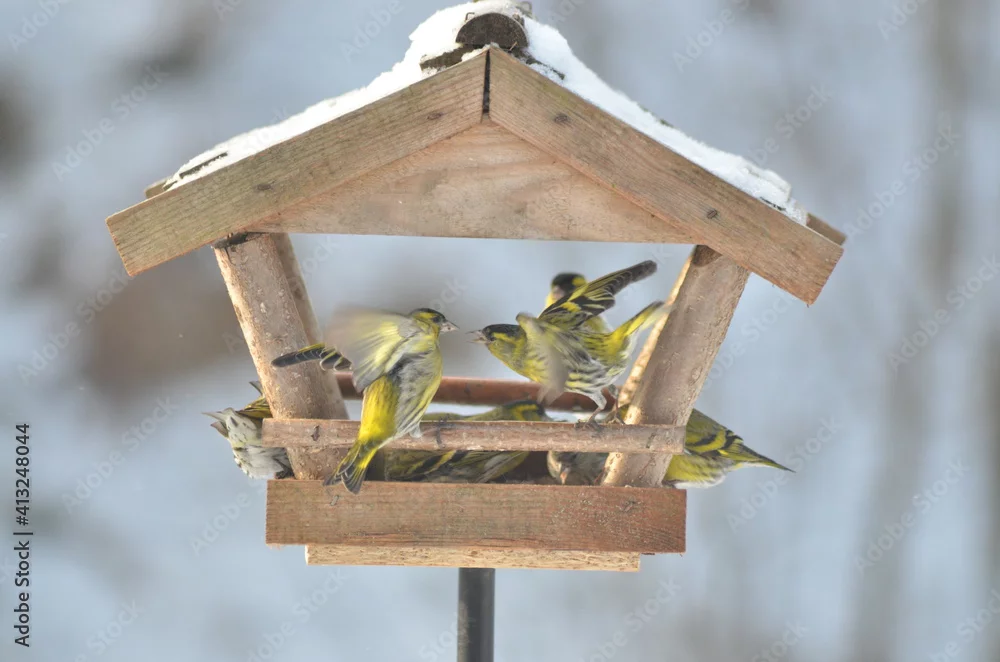 Obraz Czyżyki walczą o pokarm w karmniku podczas słonecznej mroźnej zimy