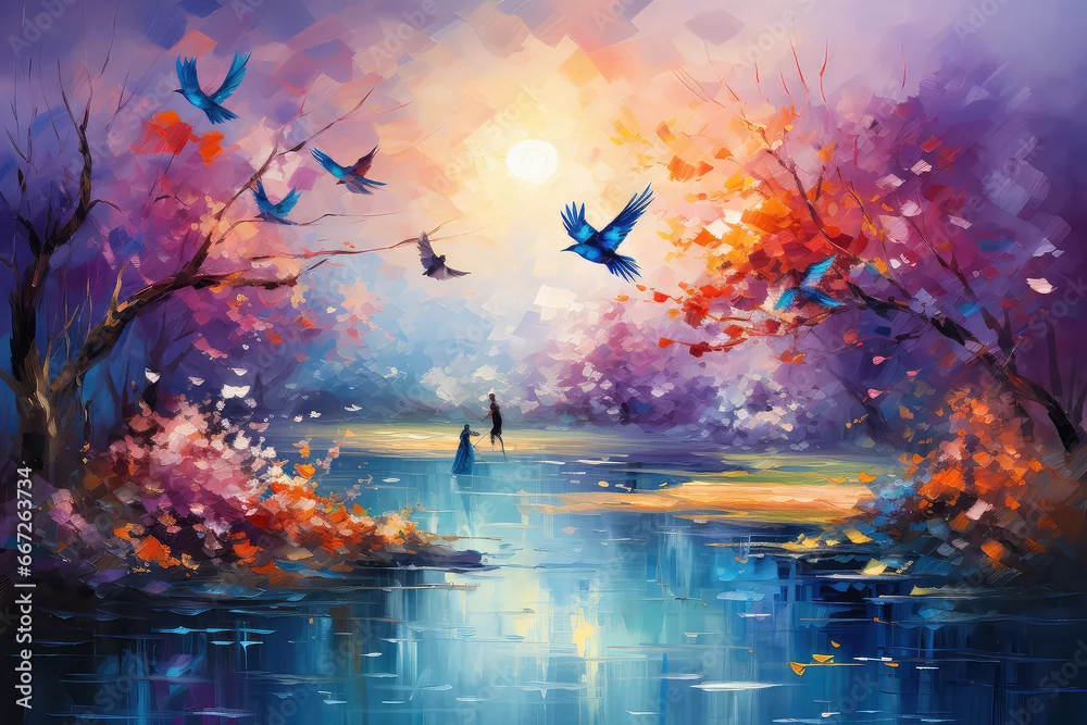 Obraz Kolorowy obraz przedstawiający ptaki nad rzeką w lesie.