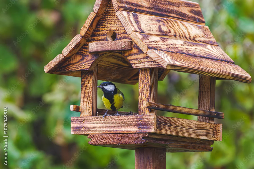Obraz ptaki w karmniku zimą i karmnik z drewna w kształcie chaty
