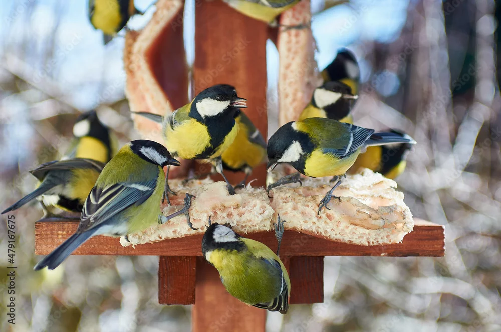 Obraz Ptaki zimą znajdują pożywienie w karmniku, ziarna słonecznika, prosa, zbóż. Sikorki bogatki obsiadły plastry słoniny. - ptaki - Picturewall.pl