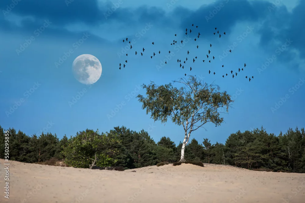 Obraz samotna brzoza na środku śródlądowej pustyni, księżyc i lecące ptaki