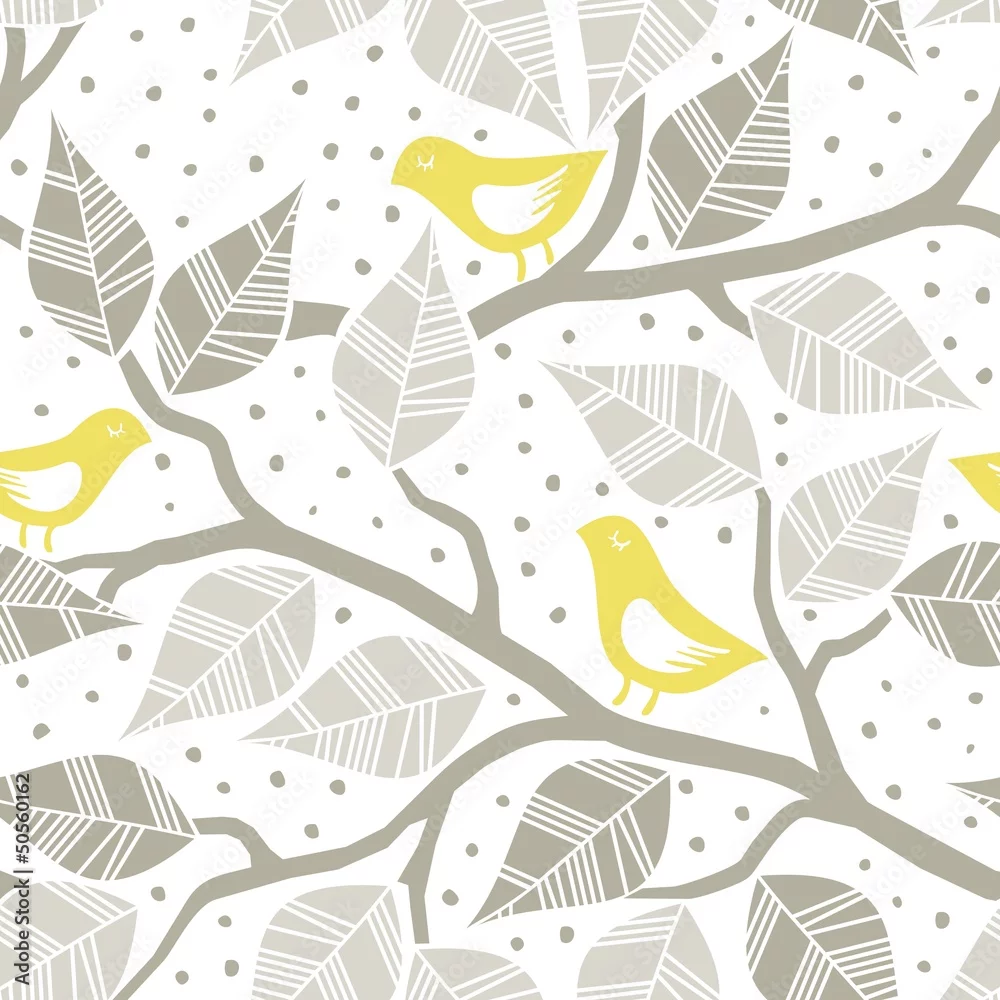 Obraz żółte ptaki brązowe liście na gałęziach nieskończony deseń