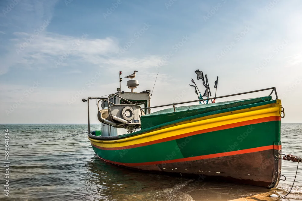Obraz Kuter rybacki zacumowany na plaży w Sopocie - znana atrakcja turystyczna