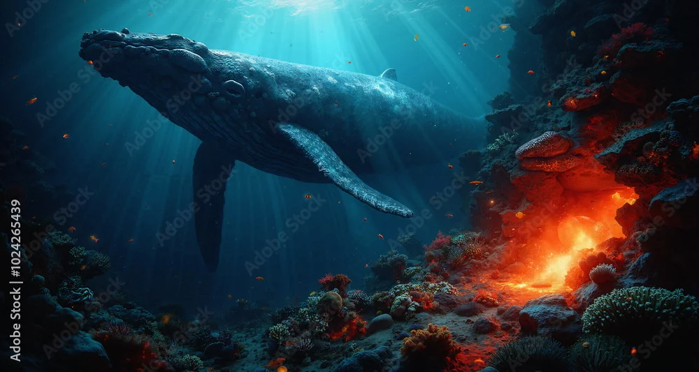 Podwodny świat raf koralowych w okolicach aktywnych sejsmicznie. Widoczne pęknięcia skał z wypływem gorącej magmy. Widzimy kolorowe rybki i stworzenia wodne. Na pierwszym planie wieloryb.