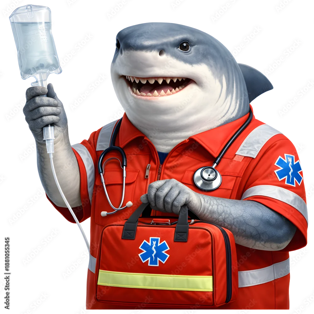 Antropomorficzny rekin przedstawiony jako ratownik medyczny, ubrany w strój ratowniczy i trzymający torbę medyczną oraz zestaw do udzielania pierwszej pomocy. Realistyczna ilustracja 3D na jasnym tle.