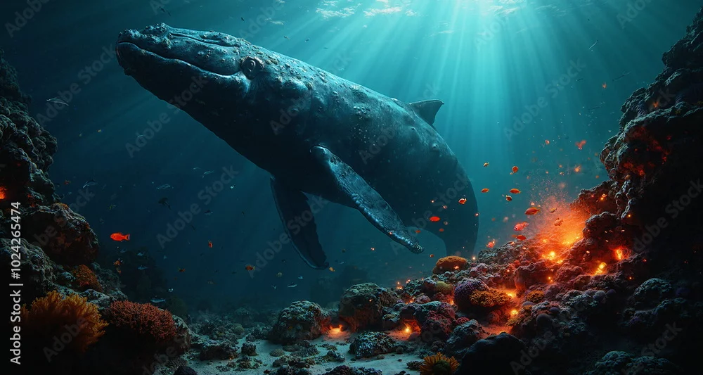 Podwodny świat raf koralowych w okolicach aktywnych sejsmicznie. Widoczne pęknięcia skał z wypływem gorącej magmy. Widzimy kolorowe rybki i stworzenia wodne. Na pierwszym planie wieloryb.