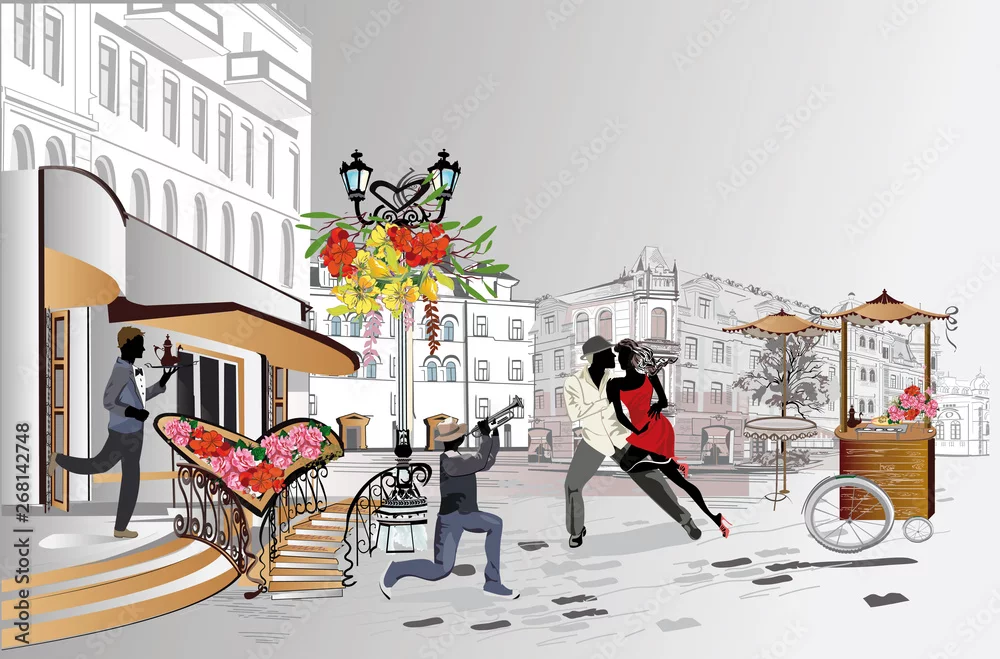 Obraz Seria kolorowych widoków ulicznych retro z modnymi ludźmi na starym mieście. Ręcznie rysowane tła architektoniczne z zabytkowych budynków. Romantyczna para w namiętnych tańcach latynoamerykańskich.