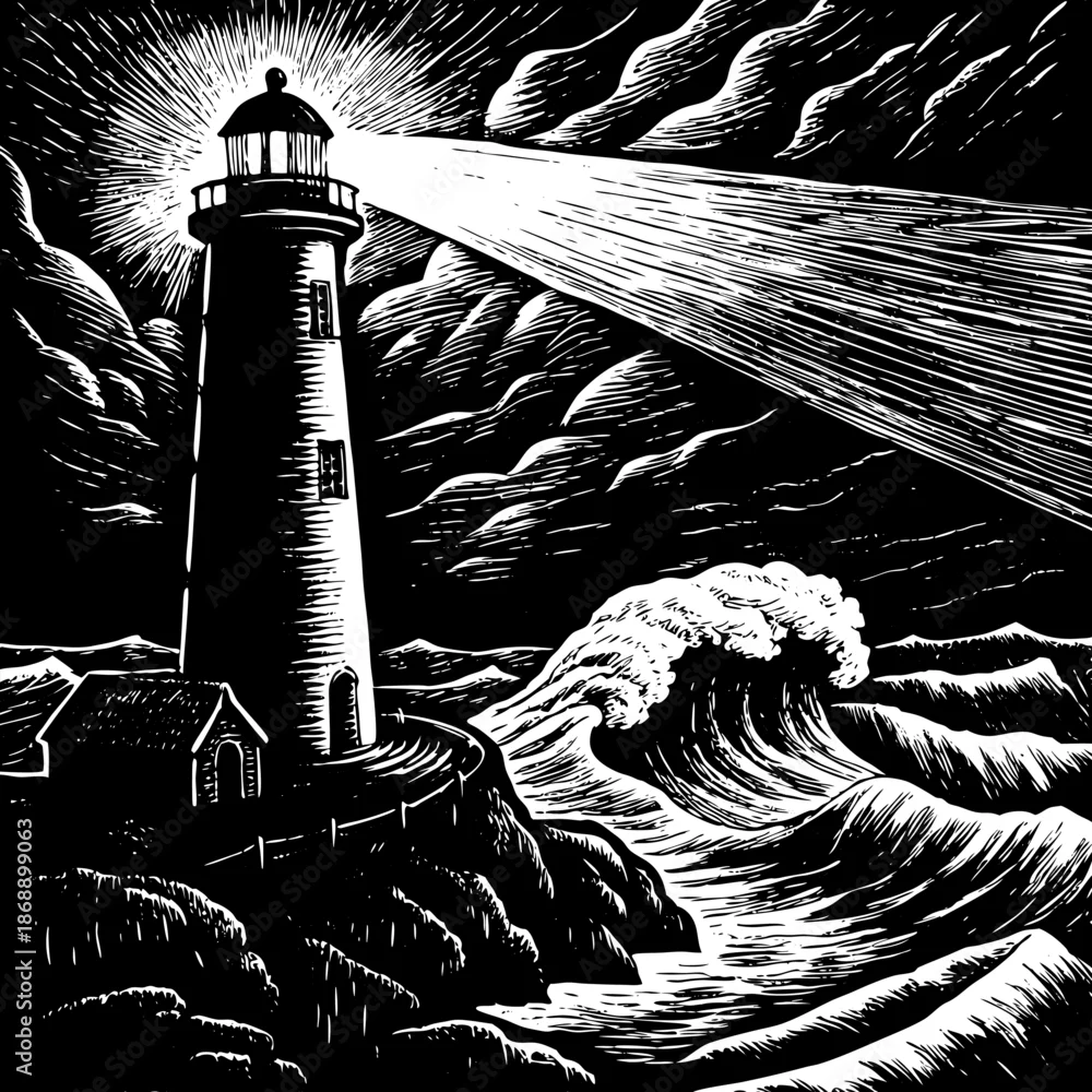 Obraz Dramatic Cliffside Lighthouse in Stormy Weather - ryby - Picturewall.pl