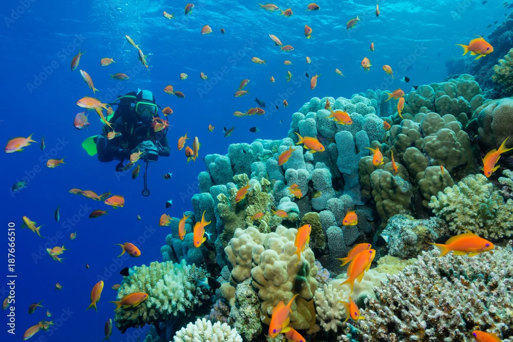 Obraz Nurek na kolorowej rafie koralowej - ryby - Picturewall.pl