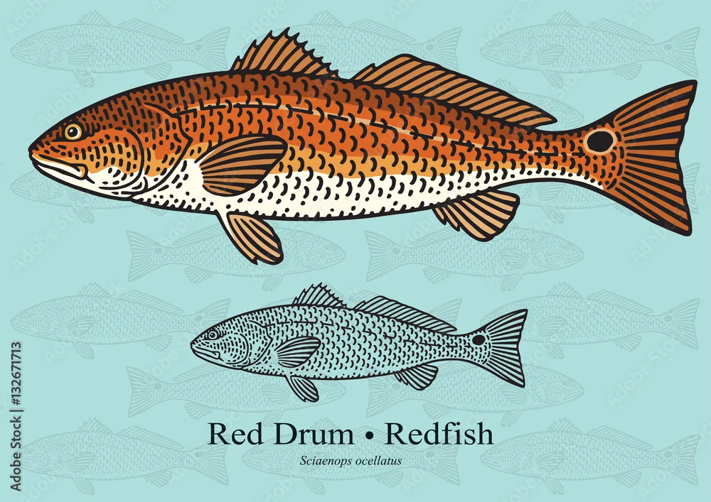 Obraz Red Drum, Redfish. Vector illustration for artwork in small sizes. Suitable for graphic and packaging design, educational examples, web, etc.