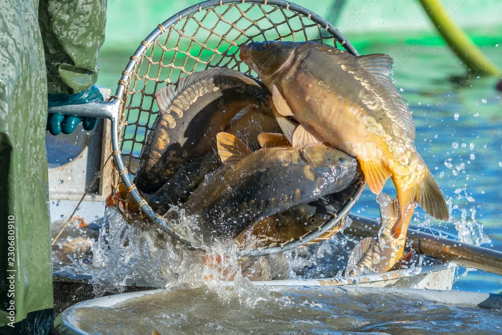 Obraz Staw rybny - sortowanie karpi i innych ryb - ryby - Picturewall.pl