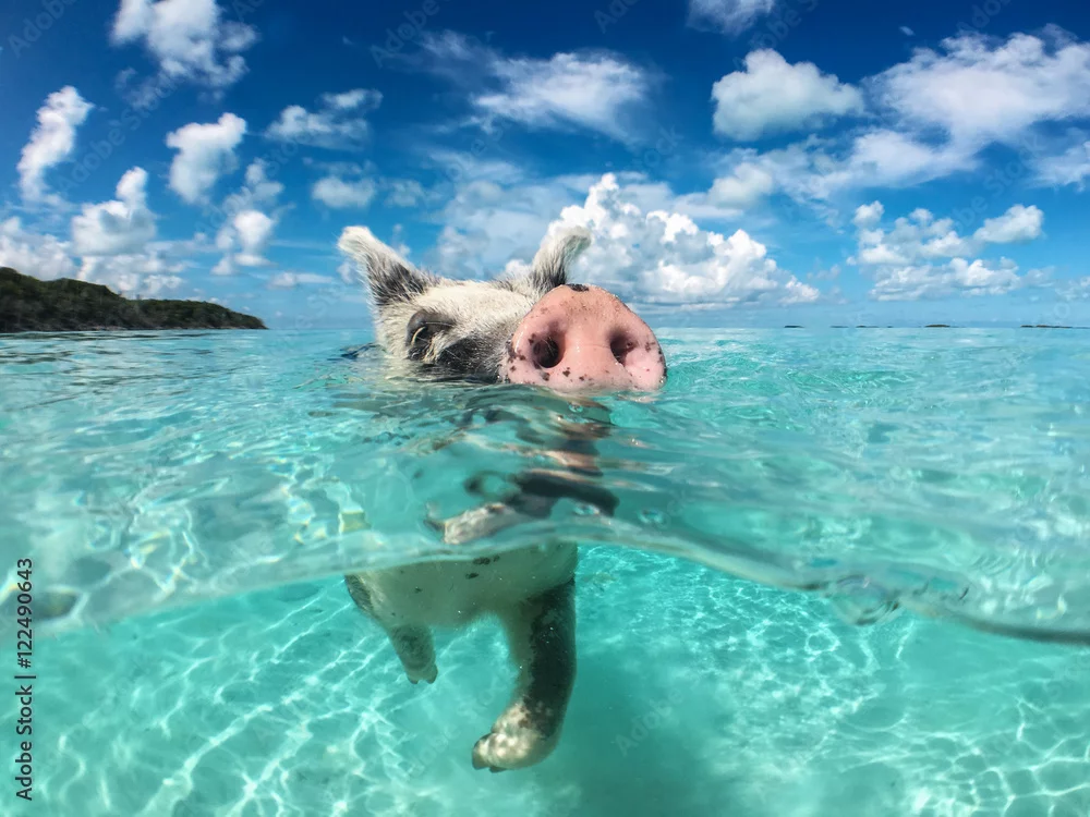 Obraz Dzika, pływająca świnia na Big Majors Cay na Bahamach