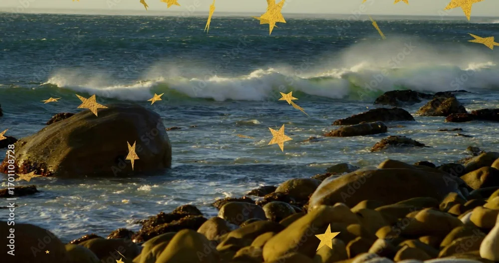 Obraz Ocean waves rolling and breaking on rocky shoreline, with round boulders and golden star sparkles