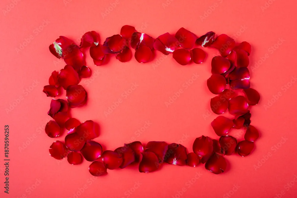 Obraz Overhead view of re rose petals arranged on coral background, copy space