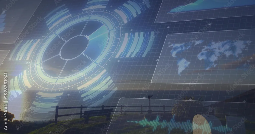 Obraz Projecting HUD over coastal hill at low sun, showing fence, grass, sea, radar, panels, wave, grid