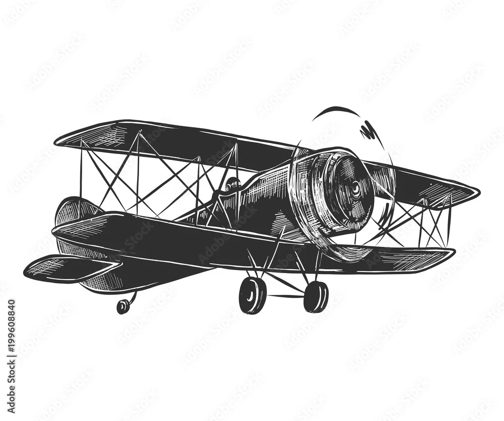 Obraz Ilustracja wektorowa wygrawerowanym stylu dla plakatów, dekoracji i druku. Ręcznie rysowane szkic samolotu w trybie monochromatycznym na białym tle. Szczegółowy rysunek w stylu drzeworyt vintage.