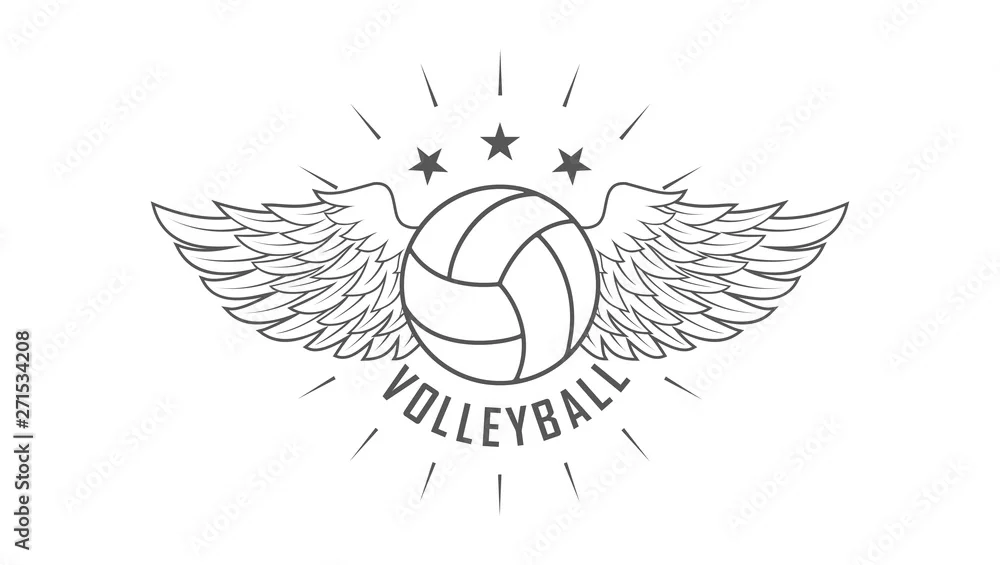 Obraz Czarno-biała ilustracja na temat sportu. Okrągła piłka do siatkówki i tekst z gwiazdami. Godło klubu siatkówki