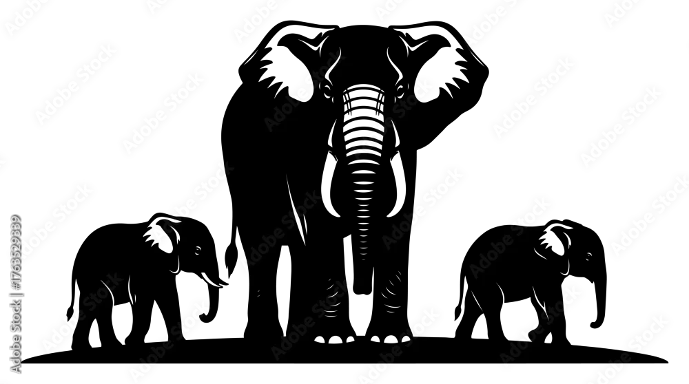 Obraz Elephant Family Silhouette Adult with Two Calves Black and White Savanna Wildlife Vector