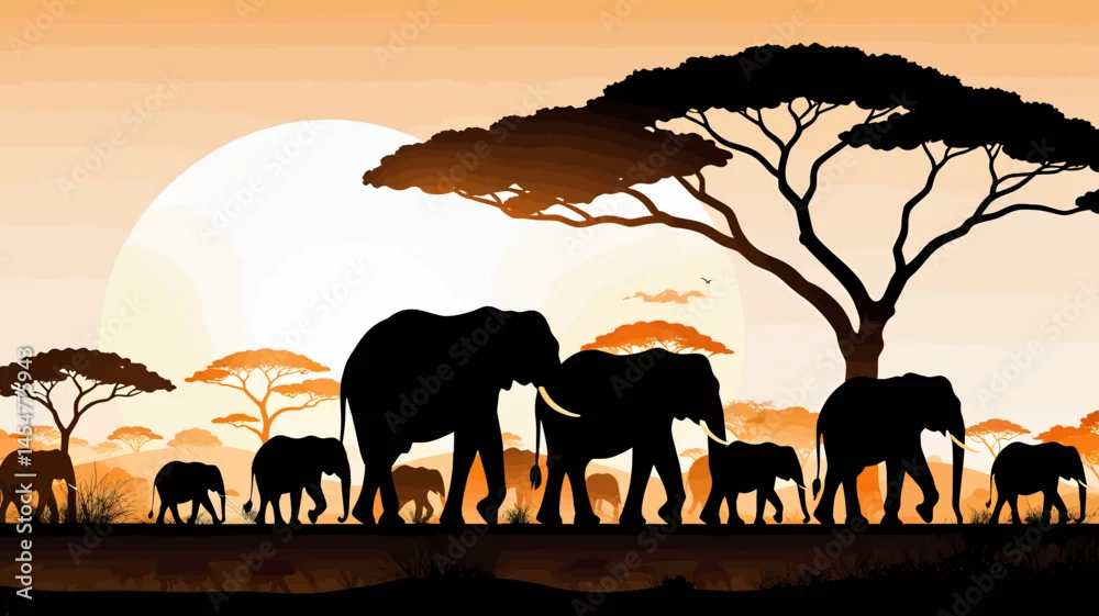 Obraz Elephant_Family_Silhouette_at_Sunset_in_African_Savanna_Wildlife_Animals_Trees_and_Orange_Sky_Beautiful_African_Landscape_170