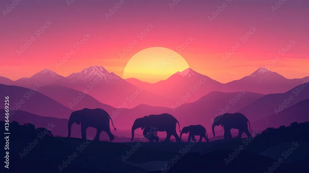 Obraz Elephant Family Sunset Silhouette with African Safari, and Mountains.