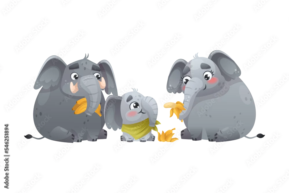 Obraz Elephant Family with Parent and Sweet Baby Eating Banana Together Vector Illustration - słonie - Picturewall.pl