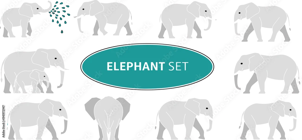 Obraz Elephant Icon Set Featuring Various Poses and Actions for Kids’ Animal and Nature Designs