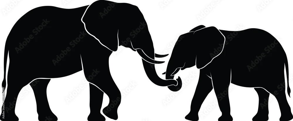 Two elephants touching trunks silhouette illustration in black and white, symbolizing family bond, wildlife connection, African animals, nature harmony, conservation, strength, and gentle