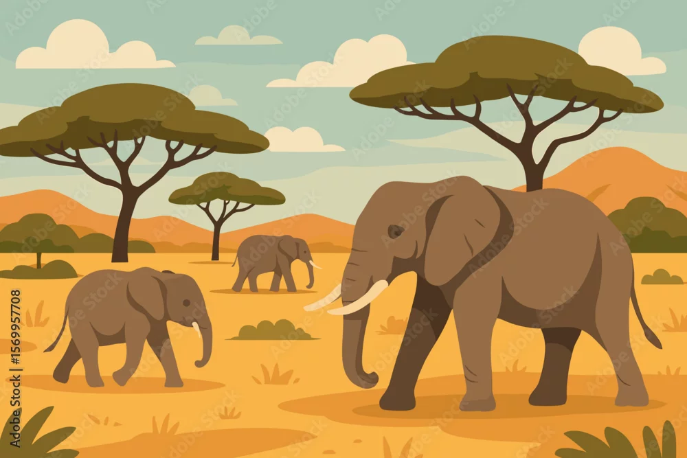 Obraz African elephant family on safari in the savanna. Wild animals in a nature landscape. Wildlife travel in Africa concept. Modern flat cartoon vector illustration background.