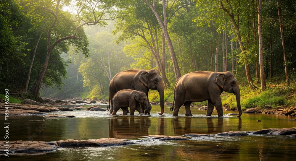 Obraz Asian Elephant Family Crossing Forest River - słonie - Picturewall.pl