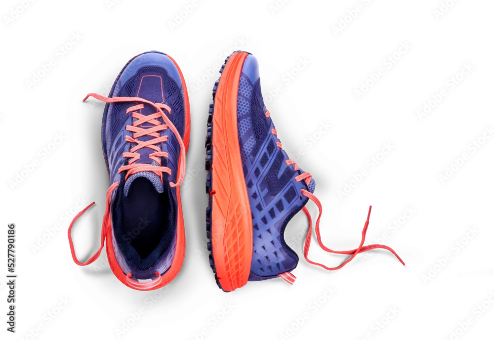 Obraz A top view of purple and orange trainers, sneakers Isolated on a flat background. - sportowe - Picturewall.pl