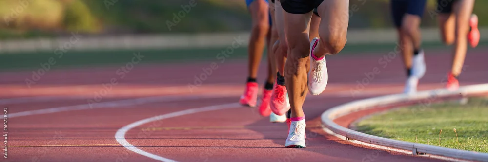 Obraz Athletics people running on the track field.Running a race on a track for sports competition and winning - sportowe - Picturewall.pl