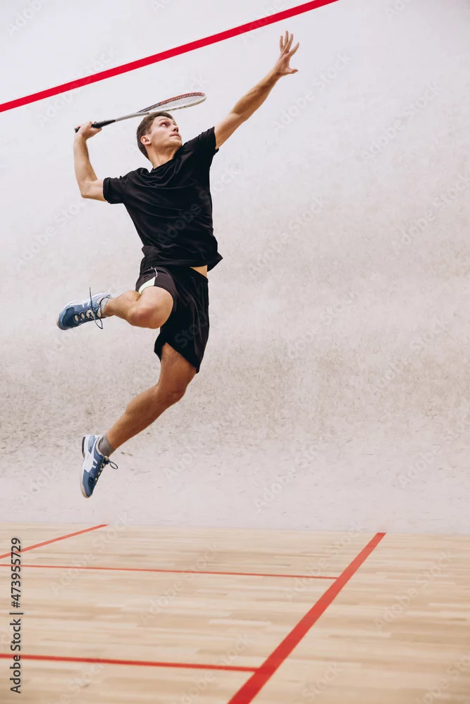 Obraz Full-length portrait of sportive boy training, playing squash in sport studio - sportowe - Picturewall.pl
