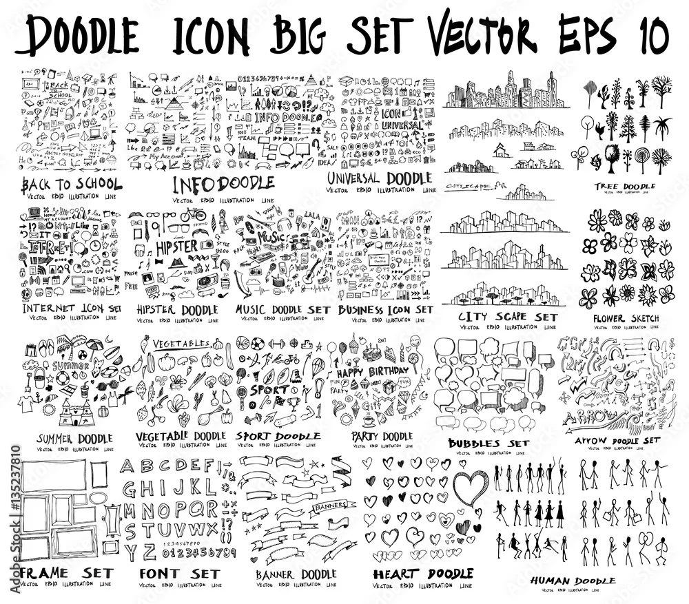 Obraz Mega set of doodles. collection of Back to school, Arrow , data, love, bubble, summer, music, flower, people, frame