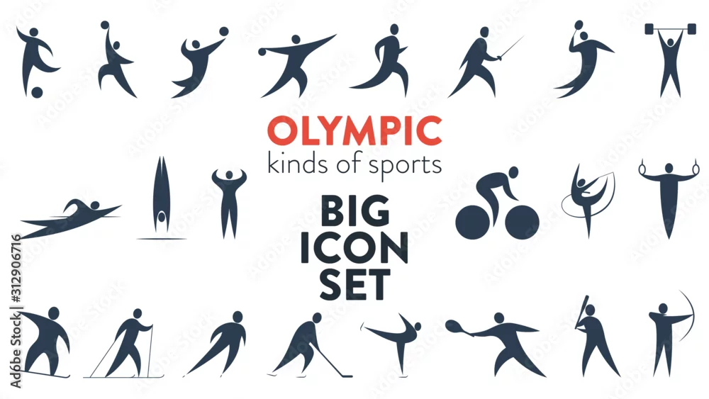 Big set of icons for different kinds of sports. Modern flat pictograms of baseball, football, basketball, gymnastics, skating, cycling, swimming, tennis, voleyball, handball, fencing, hockey and more