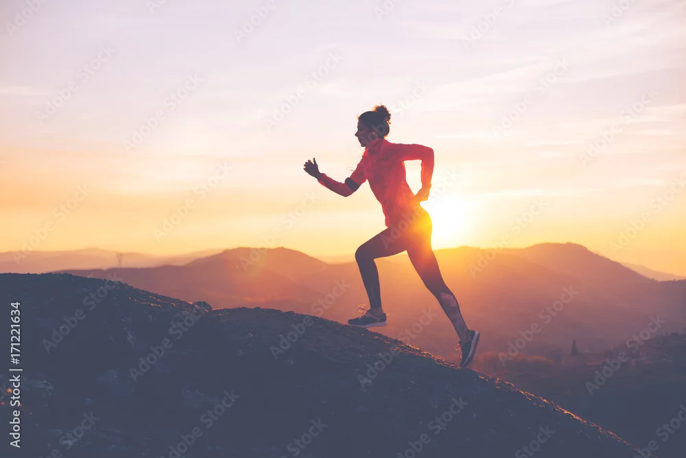 Obraz Sportowa dziewczyna kończy bieg w górach o zachodzie słońca. Sportowe ciasne ubrania. Umyślne rozmycie ruchu.