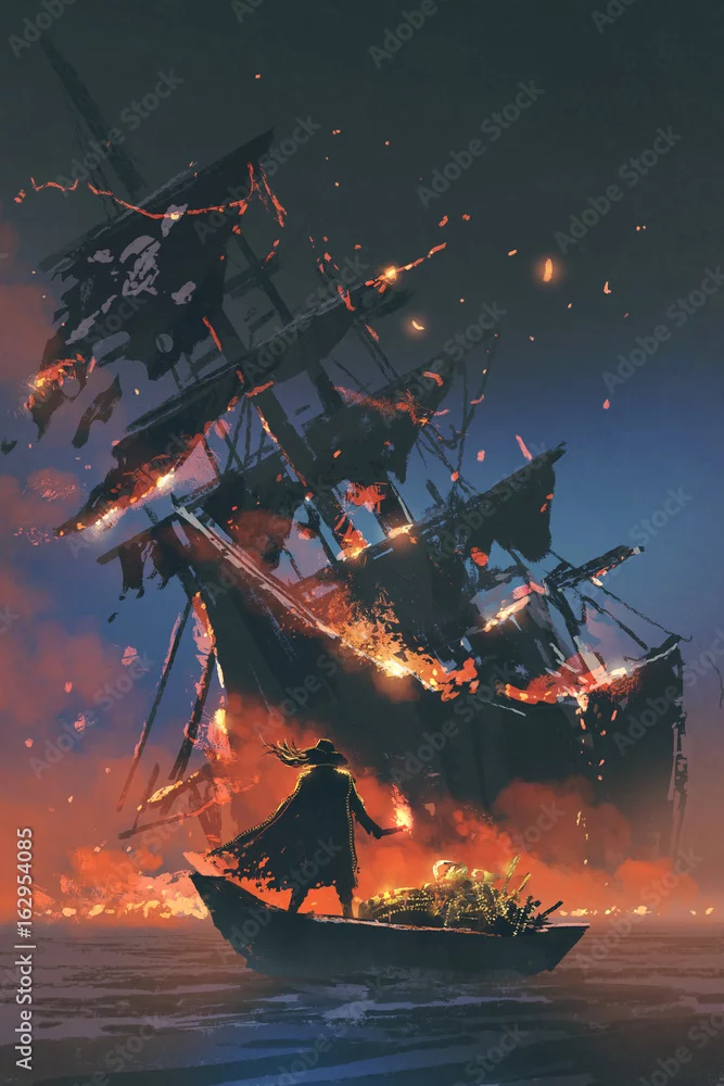 Obraz pirat z płonącą pochodnią stojący na łodzi ze skarbem, patrząc na tonący statek, styl sztuki cyfrowej, malarstwo ilustracyjne