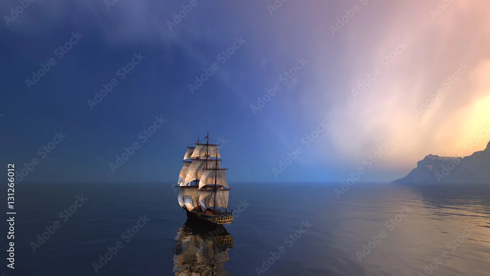 Obraz Renderowania 3D żaglowca w rozległym oceanie z małymi falami