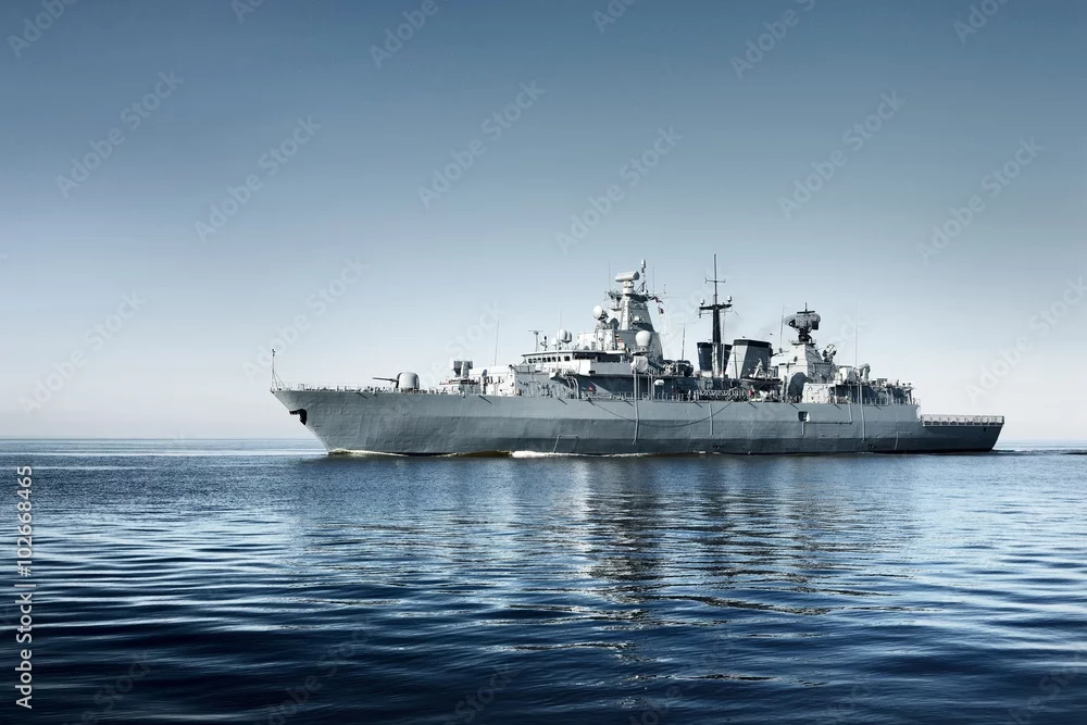 Obraz Szary nowoczesny okręt wojenny żeglujący w wodzie stojącej