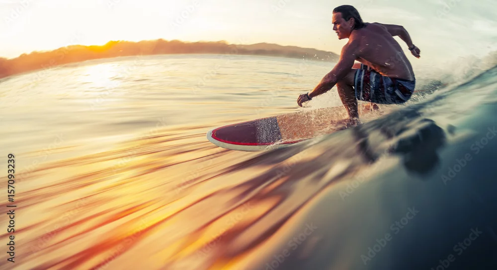 Obraz Surfer jeździ na fali oceanu o wschodzie słońca