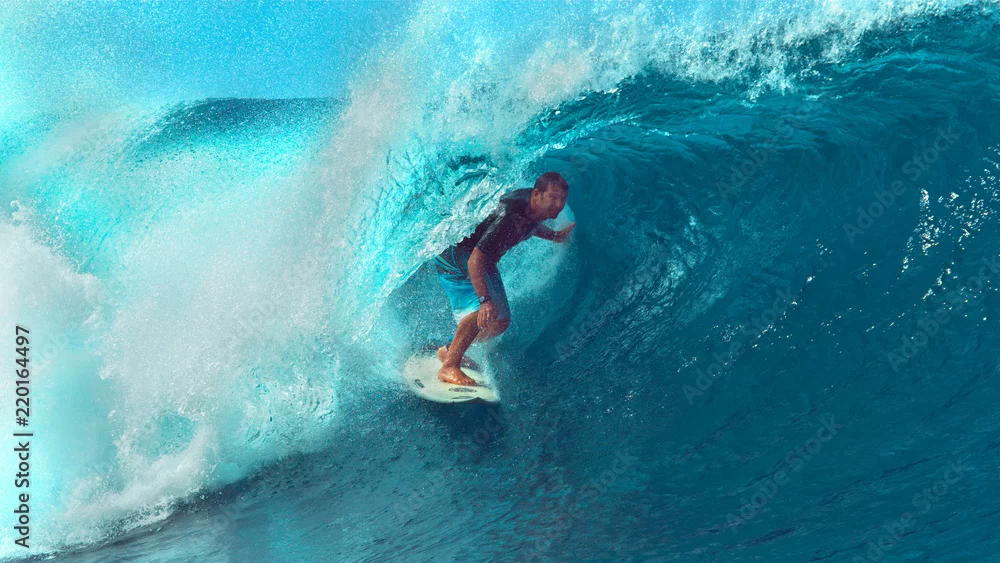 Obraz ZBLIŻENIE: Młody profesjonalny surfer jeździ na Tahiti z zapierającą dech falą.